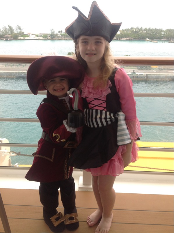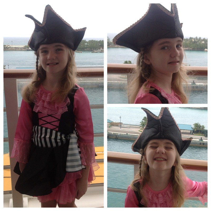 Noah dressed as Captain Hook for Halloween one year so we saved the costume and brought it with us just for the pirate party. I also packed pirate eye patches and temporary tattoos for fun. I didn’t tell the kids about each item I packed so while they were out of the room Tapanga laid it out on the bed for me to surprise them. I bought Gabby’s costume on the ship since she didn’t have any pirate gear outside of the eye patch. When I saw this costume at one of the ship’s stores I knew she would love it. She considered herself a pirate princess. Disney also left Pirates in the Caribbean bandannas for each person to wear in their staterooms.
