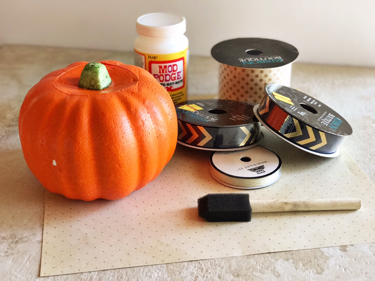Dip the sponge applicator into the Mod Podge and apply directly to the pumpkin, then add some Mod Podge to the back of your ribbon. Place one strip at a time, adding more Mod Podge as you go.