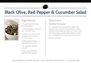 Here is a super easy recipe for you to try with California Black Ripe Olives at home. It’s also a great example of how simple it would be to enter the contest. Using black olives to dress up any meal is a nice way to add some flavor without the hassle.