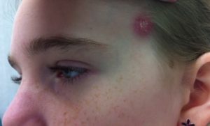 Yesterday morning I received a call from Gabby’s NeuroSurgeon asking me how her knot was doing.  I had been taking photos of it since our appointment a week ago to email to him.  The knot was getting worse over the week and the redness in the center was larger.  I called the NeuroSurgeon last Friday and left a message saying I was concerned.  He asked me to take a current photo of the knot yesterday and email to him, which I did.  He immediately responded saying I was correct, it was definitely worse and he had called another specialist to see her.  An infectious disease specialist.  Her NeuroSurgeon believed there was a chance it was staph.  Lovely, right?