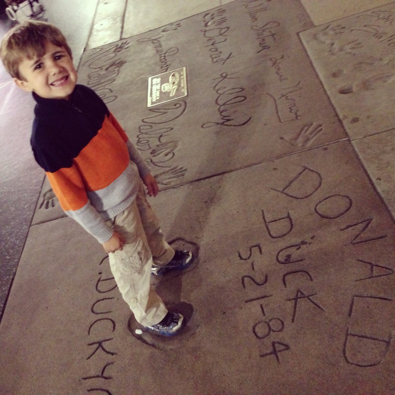 Noah went around standing in all the footprints and placing his hands on every handprint. Even if he didn’t have a clue who they were. He just found it entertaining. I thought it was cute he did recognize some of the stars like Adam Sandler from Jack and Jill. Then of course he loved standing in Donald Duck’s prints.