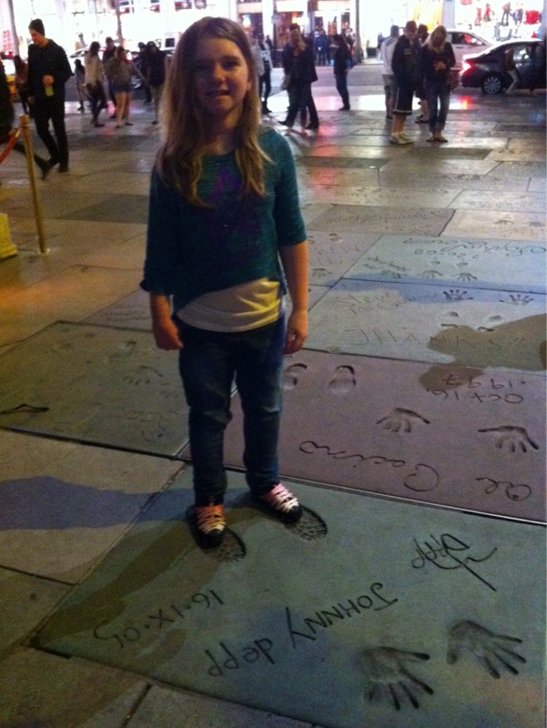 There is a huge candy store along Hollywood Blvd with Willy Wonka inside. The man looks just like the character Johnny Depp plays and he sounds like him too. Gabby was so amazed. Then as we walked through the stars prints she spotted Johnny Depp and had to stand in his footprints.