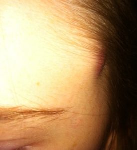 These photos were taken yesterday. You can see that the knot is still fairly large and is really red. It’s not perfectly round so it goes back a ways past the hairline. Her NeuroSurgeon was concerned, especially that it has changed colors. We discussed several options and decided to… monitor it. He brought us into his office and we looked over all her previous MRI’s, CT scans and examined the knot how it is now. He agreed with me that she looks great besides the knot and seems to be doing well mentally and physically. He is now starting to lean towards believing the knot is not caused from increased pressure. Yes, Gabby’s spinal tap did show increased pressure but he isn’t so sure that the pressure could actually cause a knot of this size for this long.