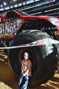 Noah thought it was awesome to take photos next to the big monster trucks. The tires were larger than him.