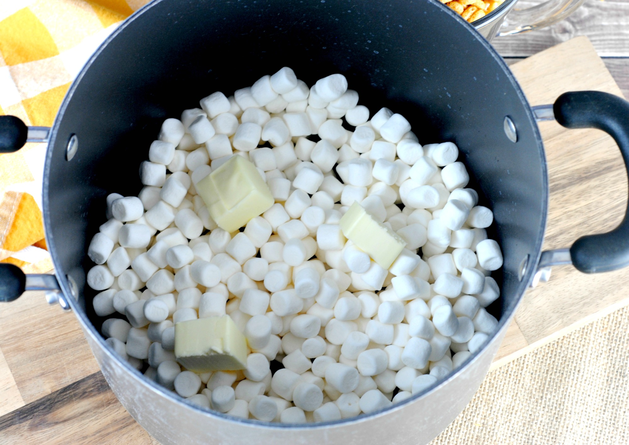 - Place the butter and 10 oz bag of mini marshmallows into the bottom of a large pot.