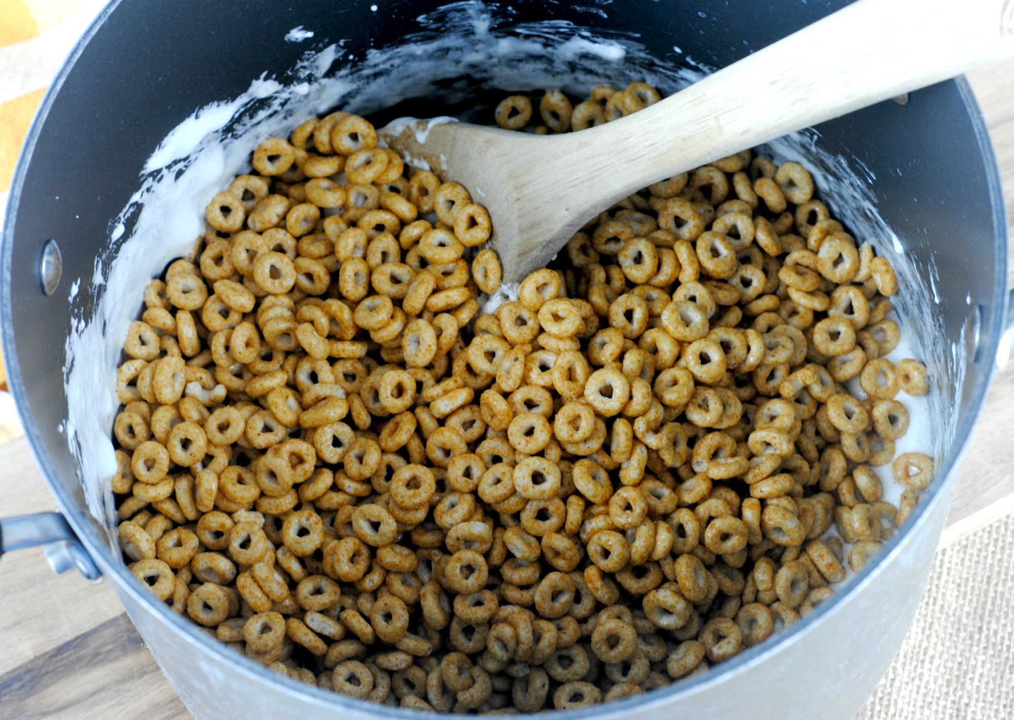 - Once the marshmallows have melted 3/4 of the way remove from heat and pour in the Pumpkin Spice Cheerios.