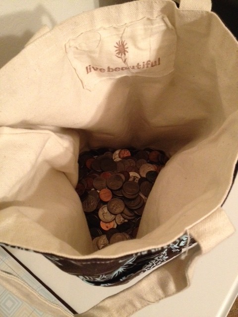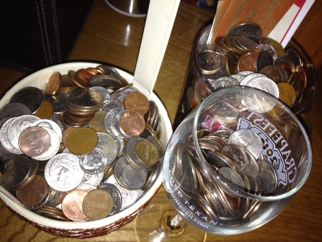 For the past couple of years the kids and I have added coins to a few containers in the house.  Just random containers such as a collectible wine glass I received at a festival, a metal basket and even a collector cup I got from the Broadway Musical, West Side Story.  For the past year the coins have set on the top shelf inside a cabinet in my office, not being touched or cashed in.  We even had some coin wrappers available to roll the coins and take them to the bank but never got around to it.