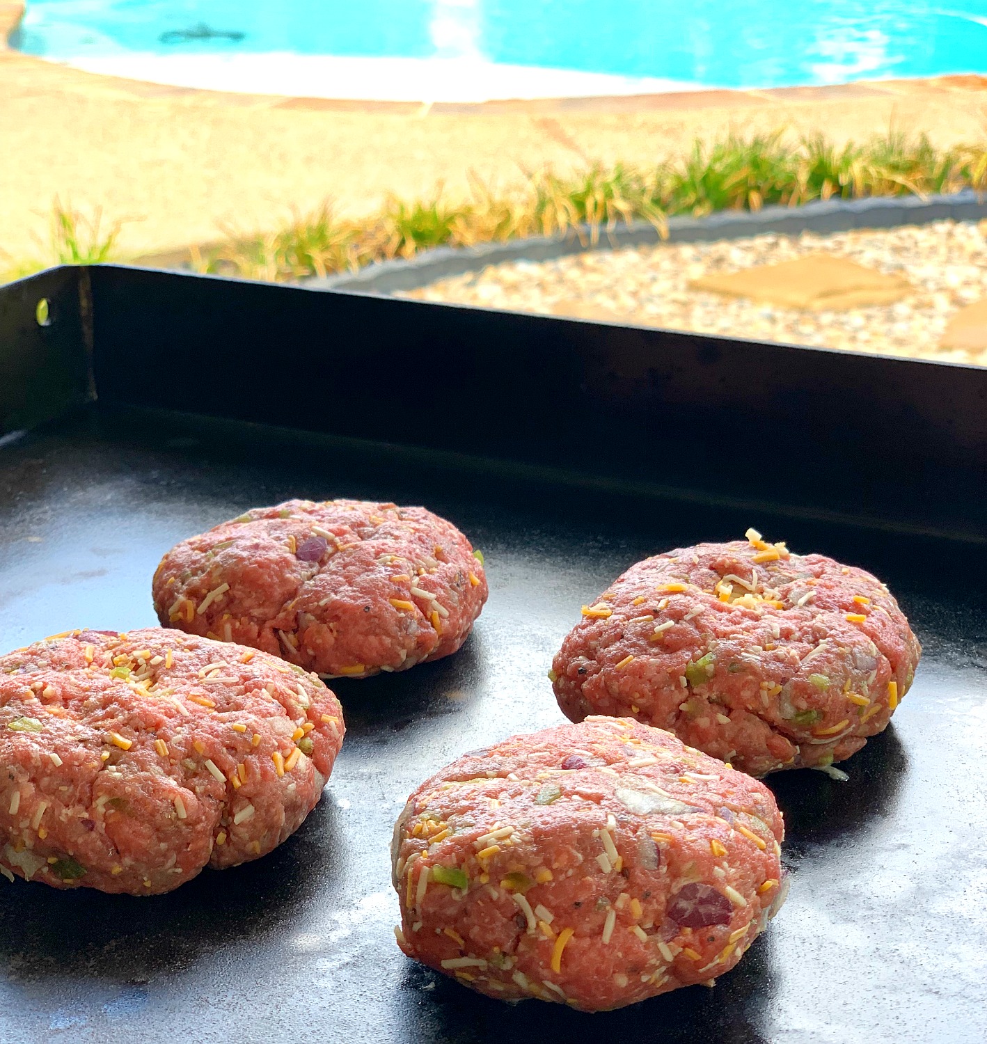 I love cheese. Instead of just topping our hamburgers with a slice of cheese, I like to mix shredded cheese into my meat. The cheese serves as a binding when melted to help hold your patties together so they do not fall apart on the grill.